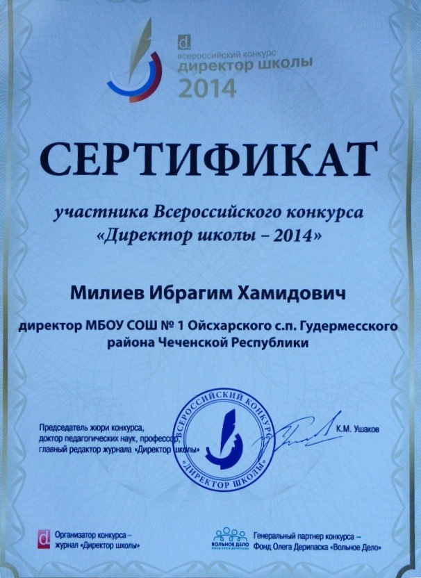 Участие директора МБОУ СОШ №1 Ойсхарского с.п." Милиева Ибрагима Хамидовича на Всероссийском конкурсе "Директор школы-2014"