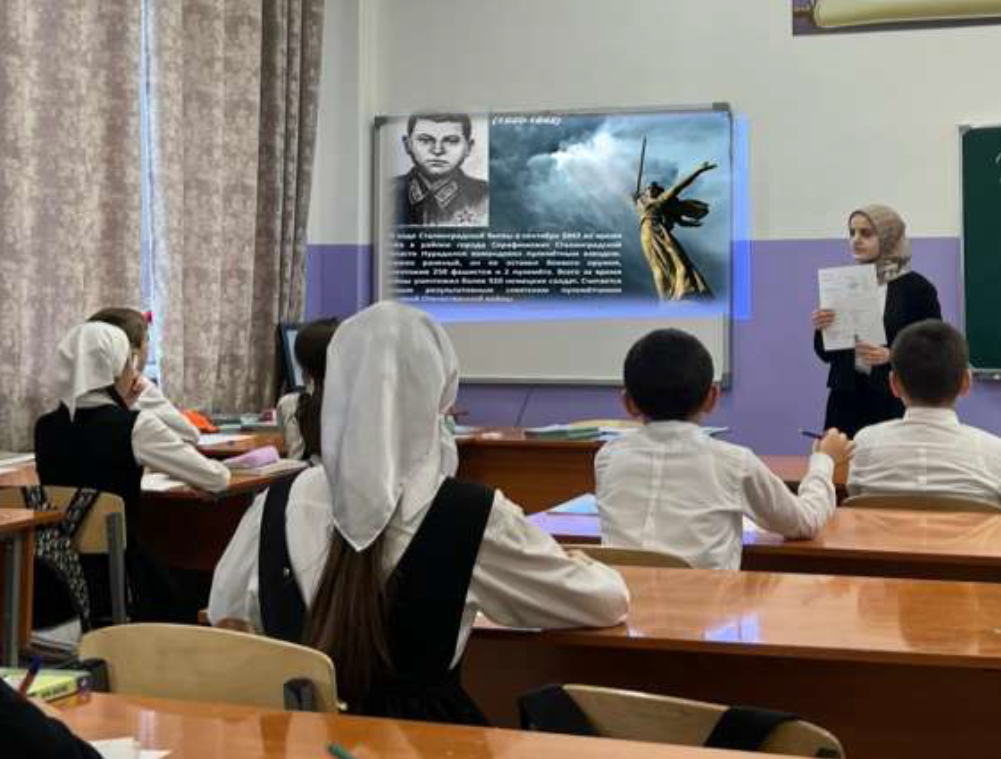 29.11.202328 ноября в МБОУ «Ойсхарская СШ №1» прошел урок по теме «Подвиг пулеметчика Нурадилова Х.Н.»Урок провела учитель Муталиева М.Р.
