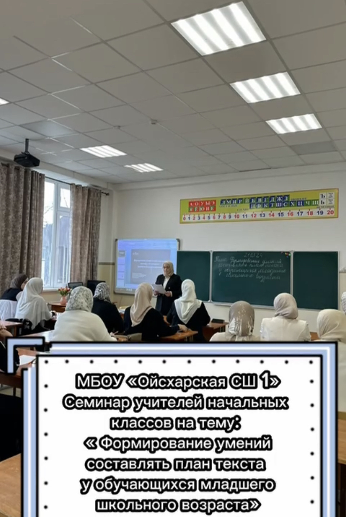 в МБОУ "Ойсхарская СШ 1" проведён семинар по теме"Формирование умений составлять план текста у обучающихся младшего школьного возраста".Провела семинар учитель начальных классов Берсанова Марьям Ломалиевна.На семинаре присутствовали учителя начальных классов в количестве 23 человек.